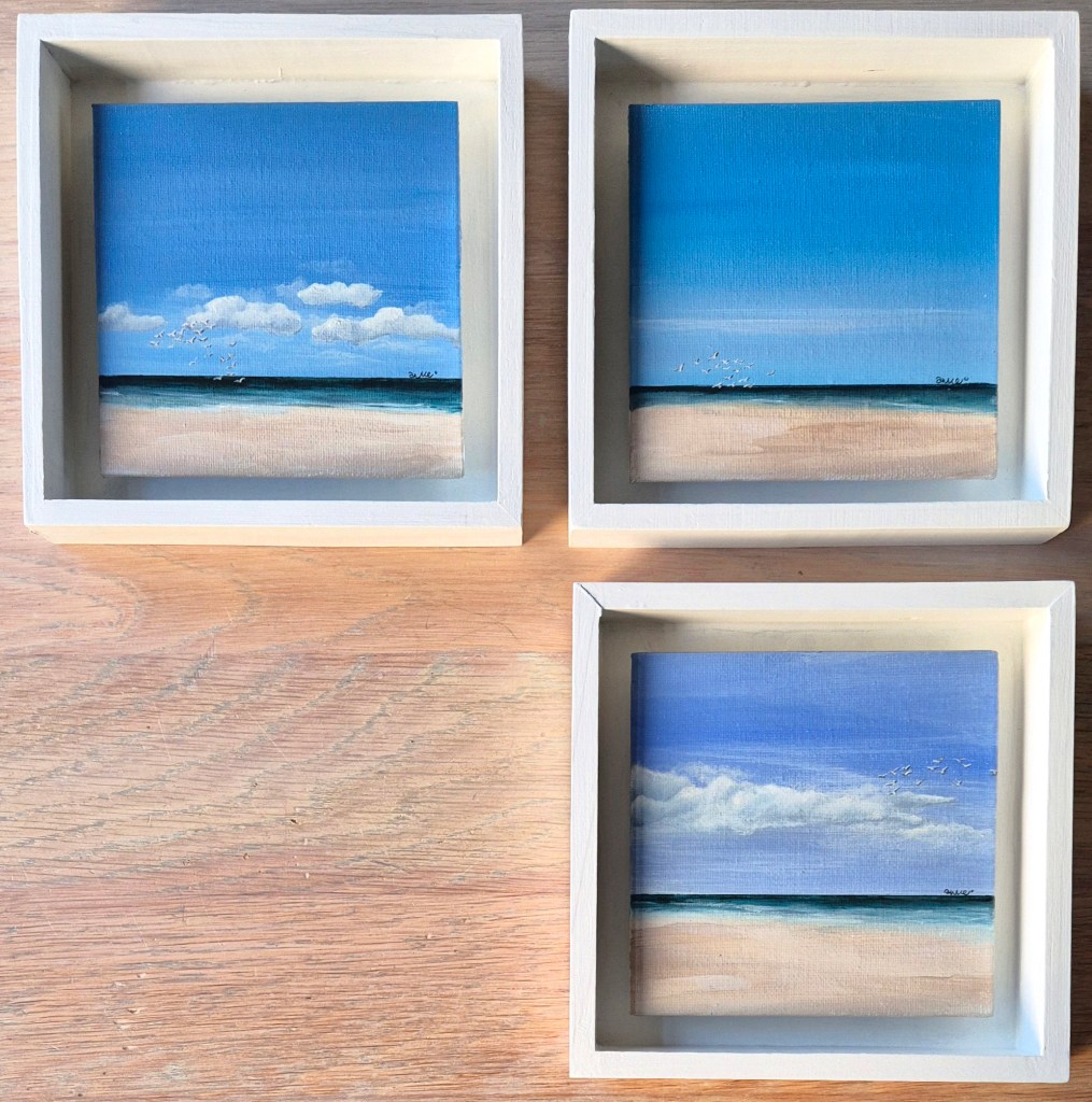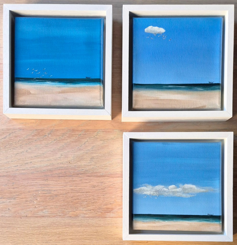 Houten bakje 16 x 16 x 3 cm met acrylverf op ‘zwevend’ 10 x 10 cm canvas paneel